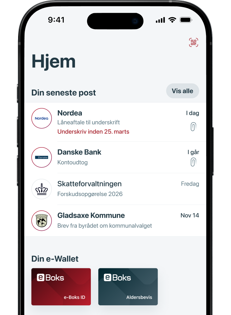 samlet ét stedHvorfor vælger de fleste virksomheder e-Boks, når de skriver til dig? Fordi de ved, at du trygt kan svare, underskrive aftaler og få det bedste overblik, når al din vigtige post er samlet ét sted.