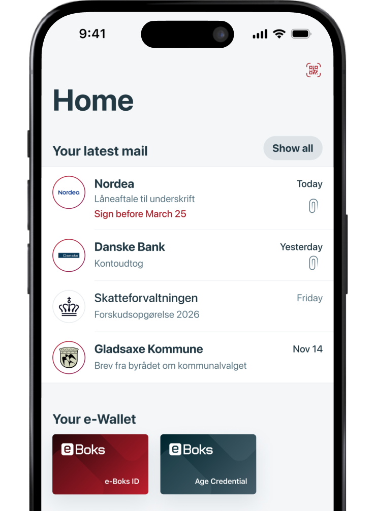 In your personal e-Wallet in the e-Boks app, you will find your e-Boks ID. Here you also have access to other digital credentials – for example a digital proof of age, which is already available.