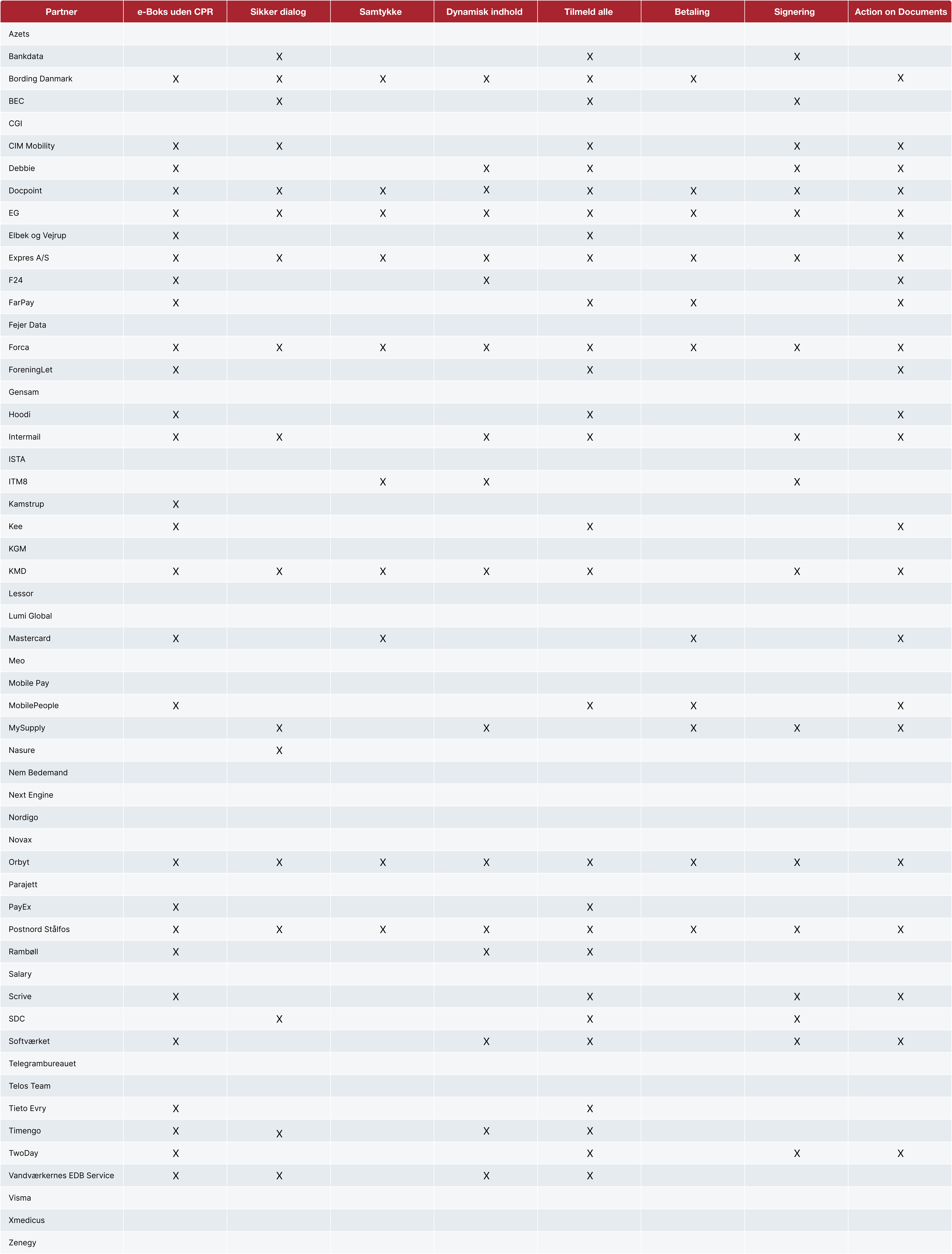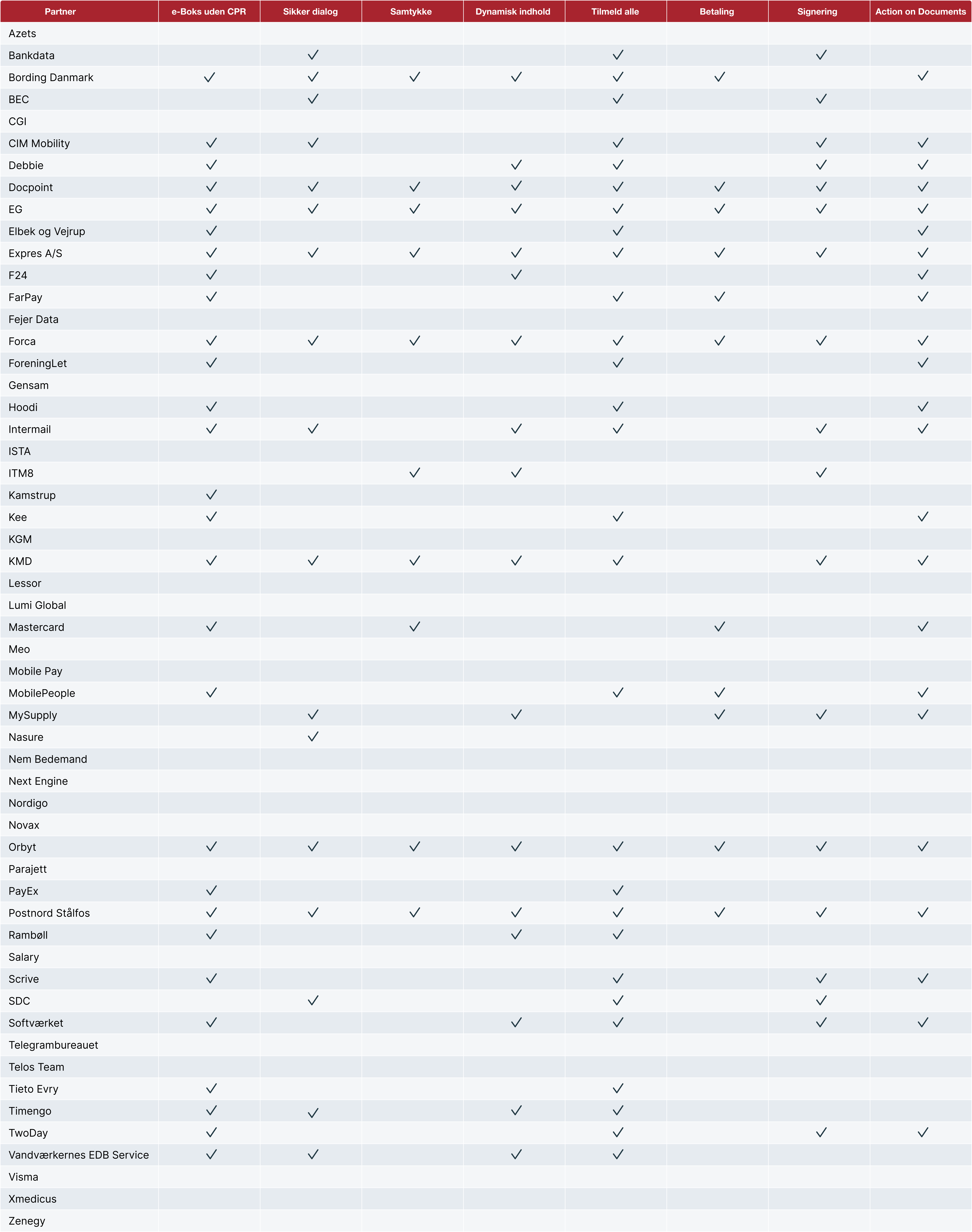 Her får du et overblik over hvilke e-Boks partnere, der understøtter hvilke Value Added Services.